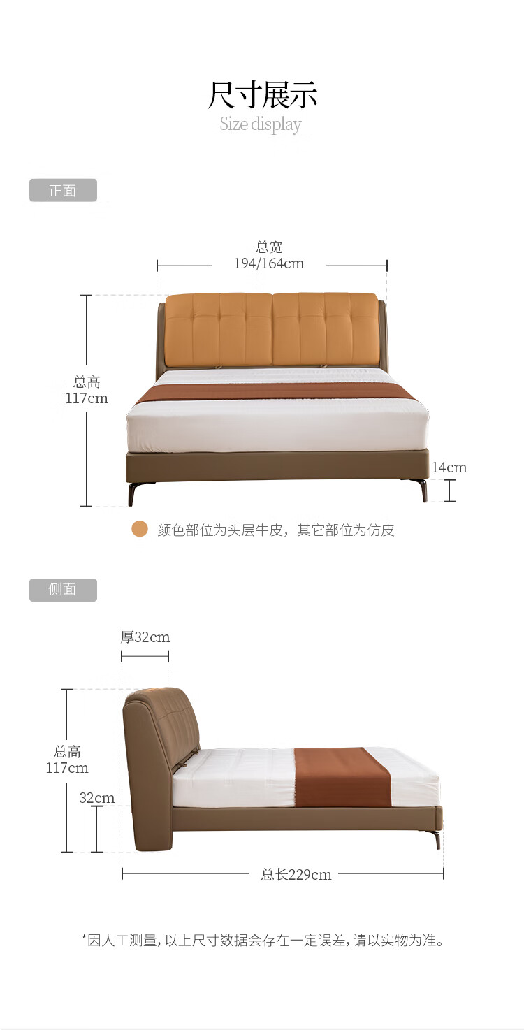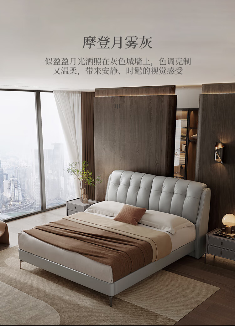 全友家居 床 主卧轻奢皮床 双区头层牛皮软包床屏大床 简约家用卧室家具真皮双人床 1.8x2米软床AK1(2-2)