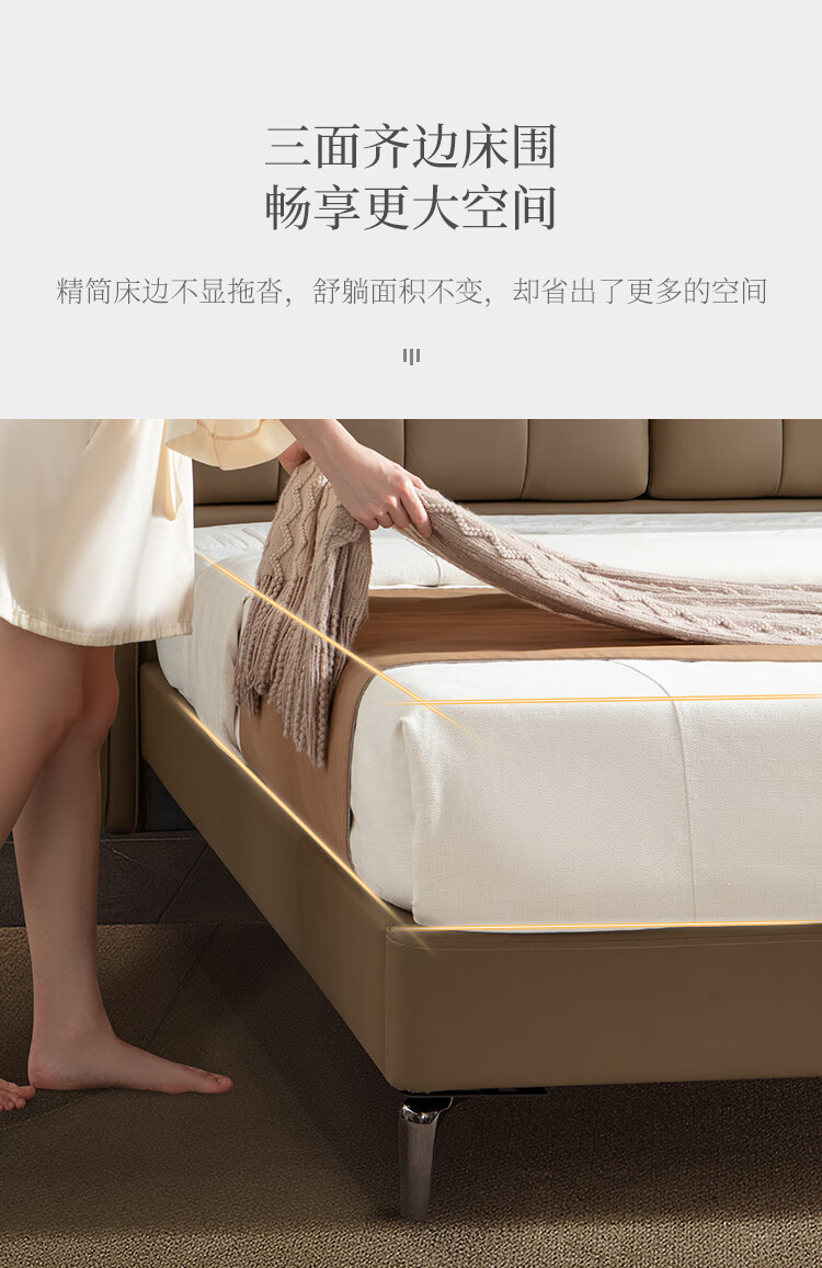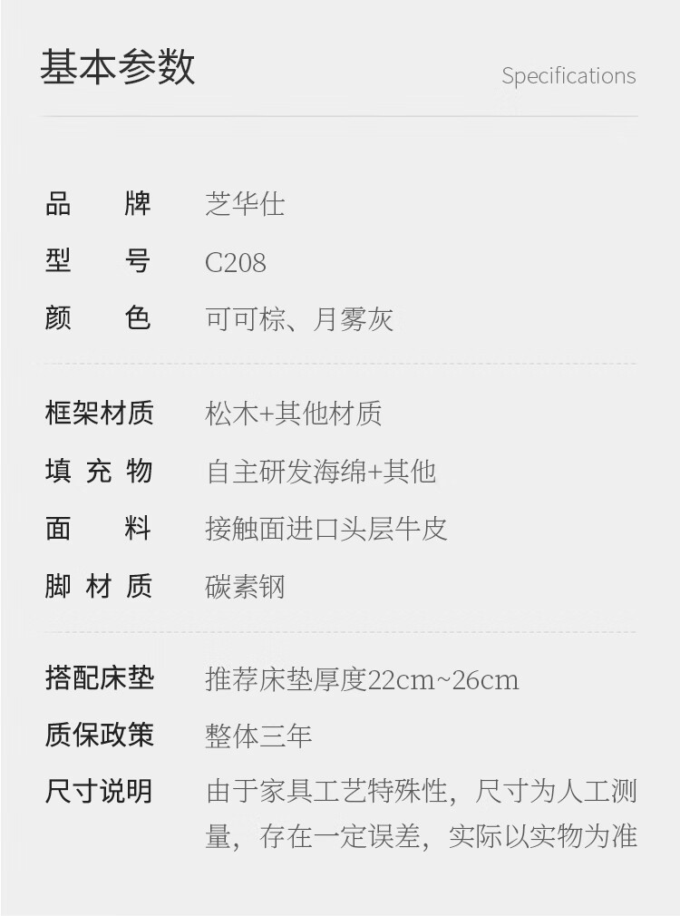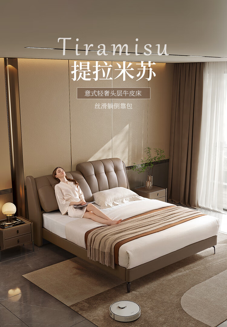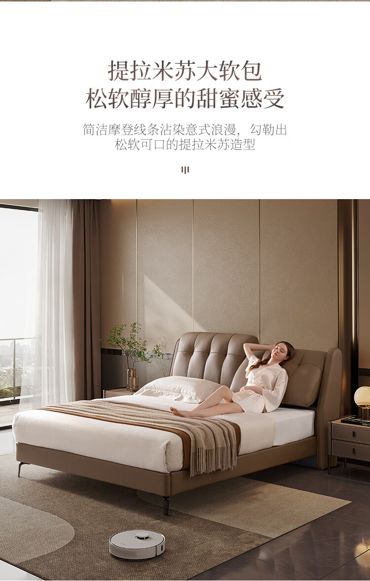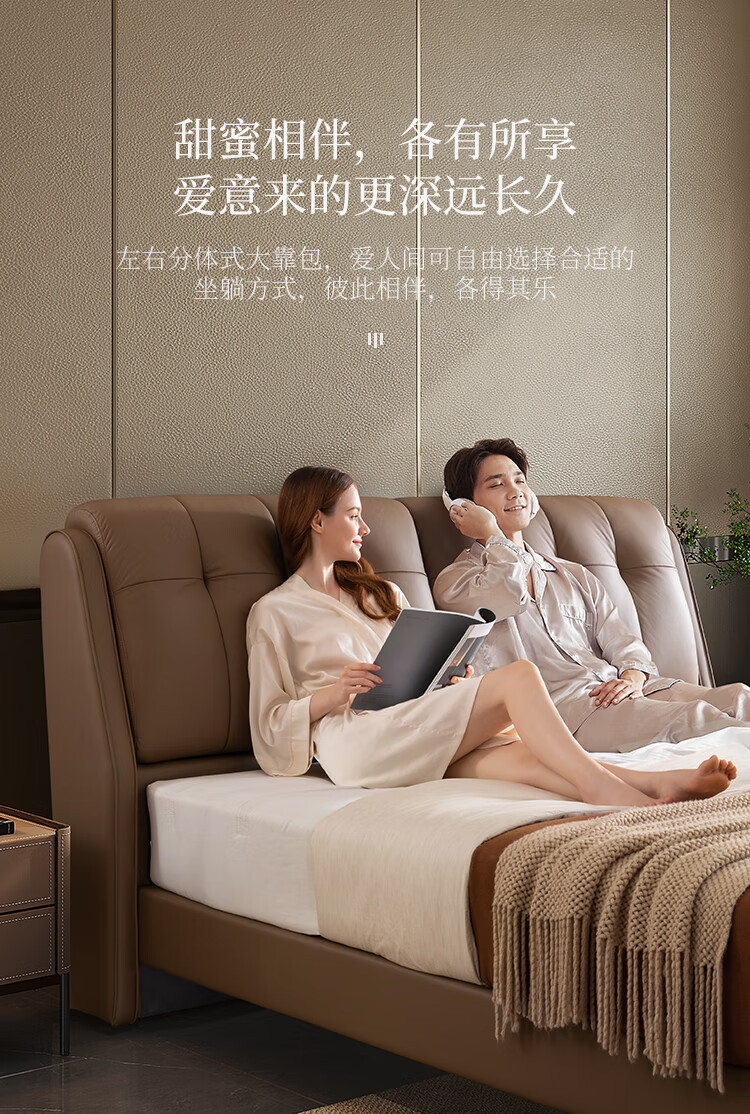芝华仕真皮床意式轻奢简约主卧双人软包婚床C208款可可棕1.8米送床垫