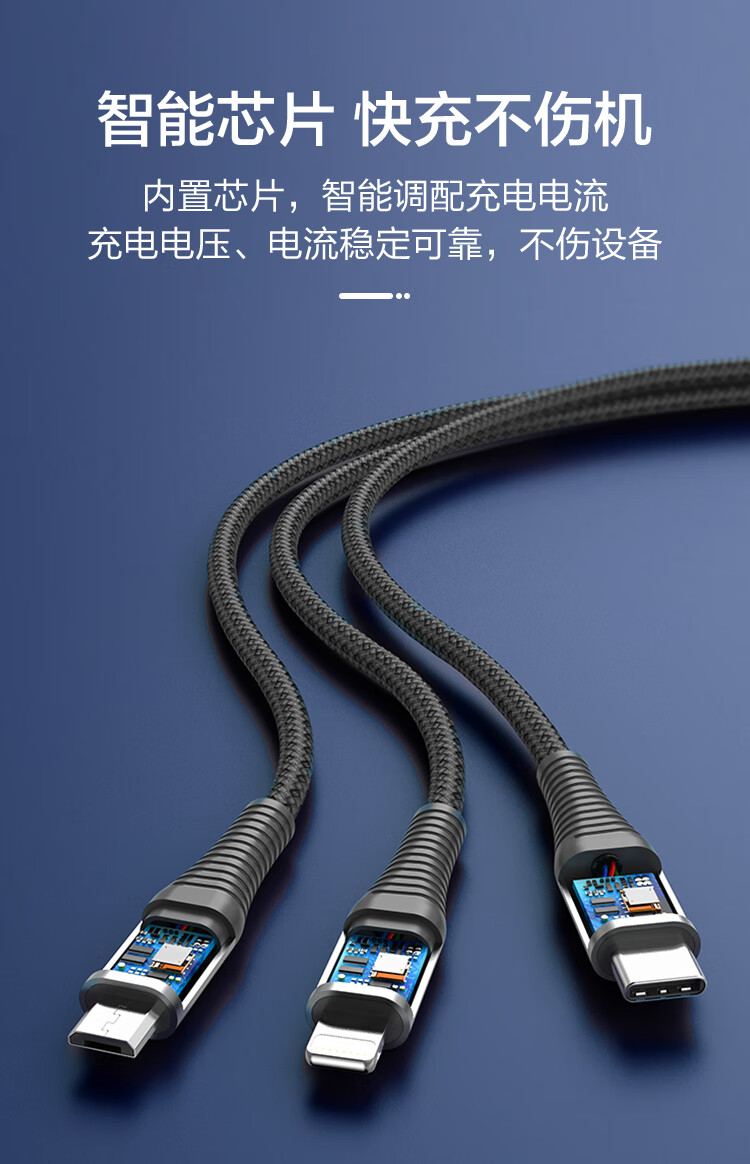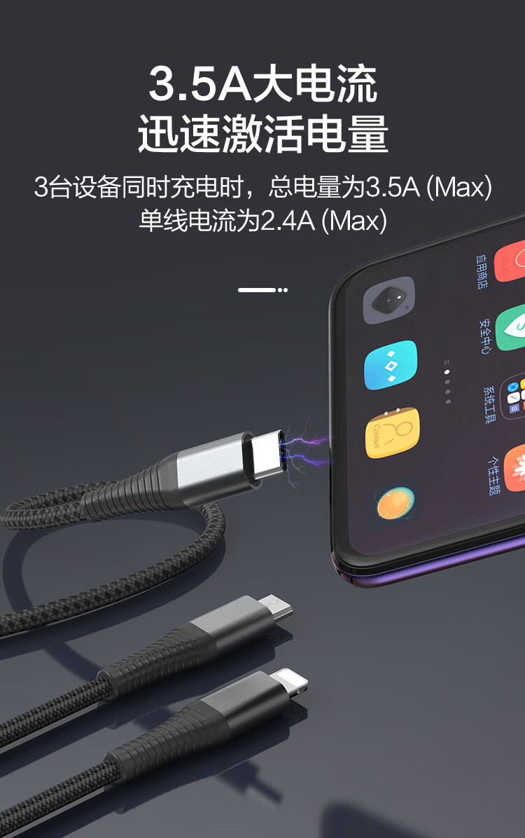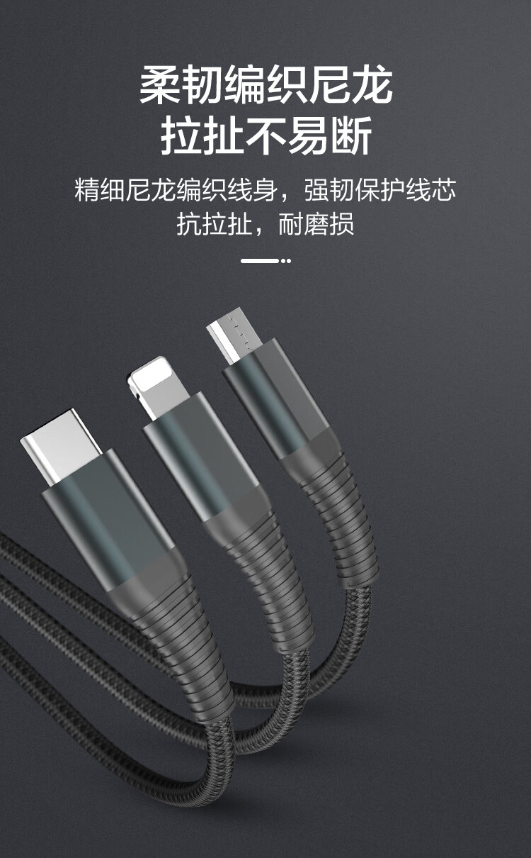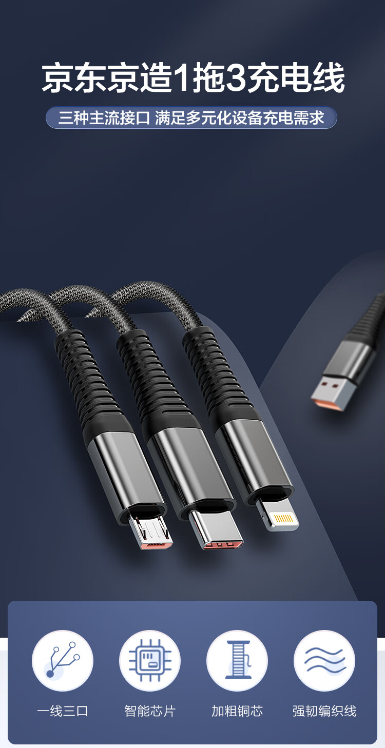 京东京造 三合一充电线快充多功能适用苹果Type-c安卓手机多头iPhone14/13/12小米华为一拖三车载 黑