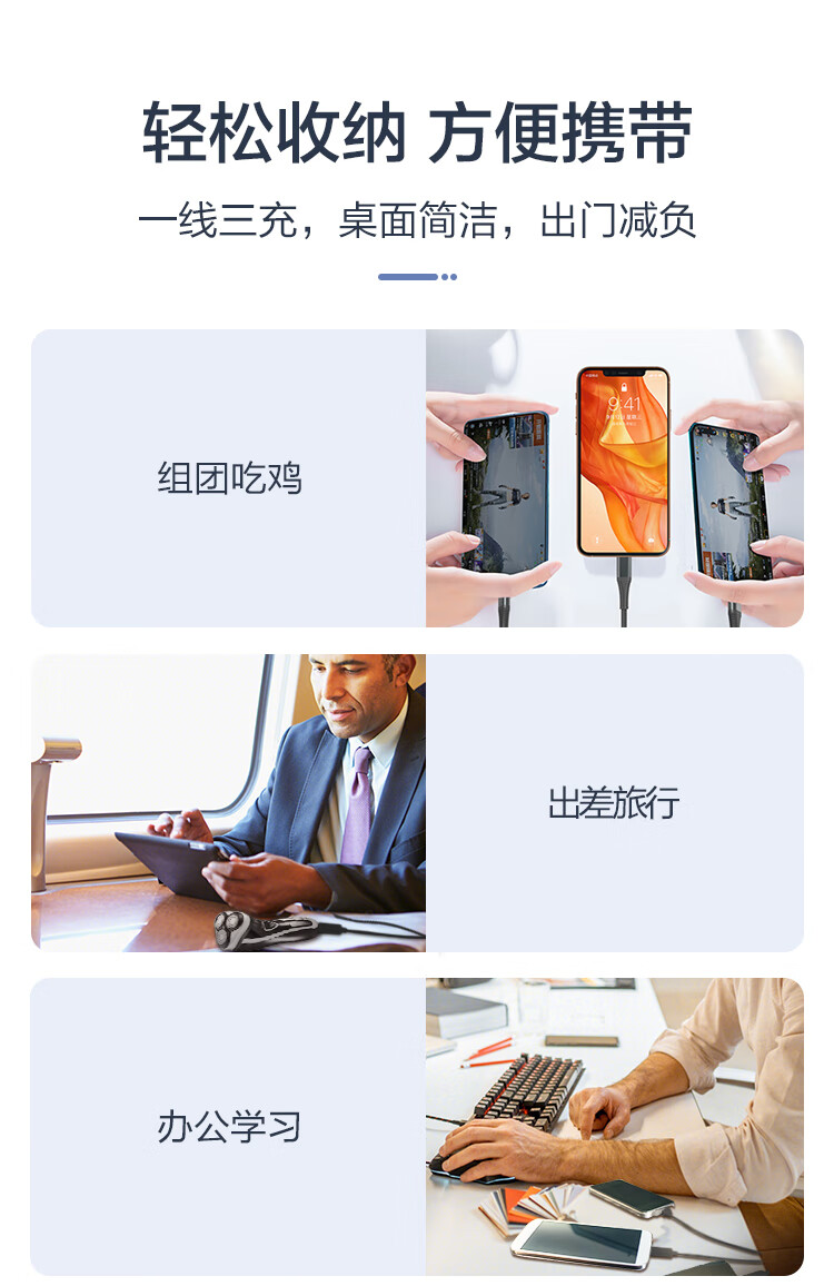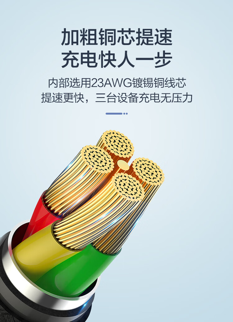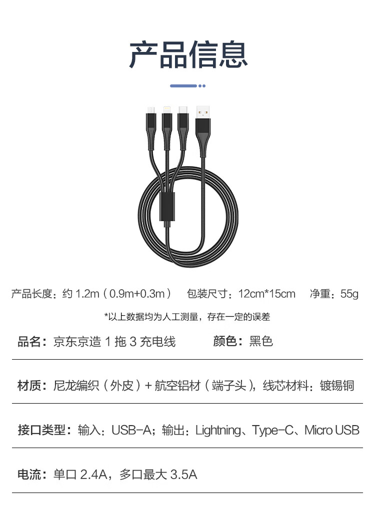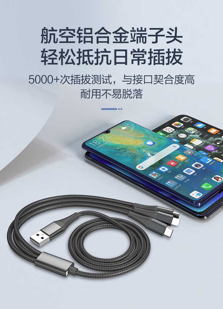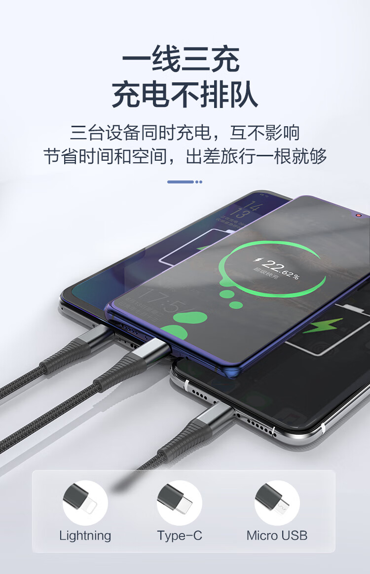 京东京造 三合一充电线快充多功能适用苹果Type-c安卓手机多头iPhone14/13/12小米华为一拖三车载 黑