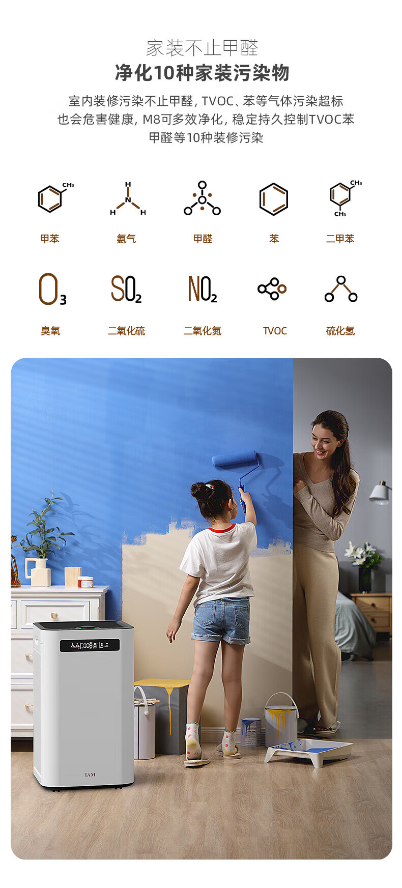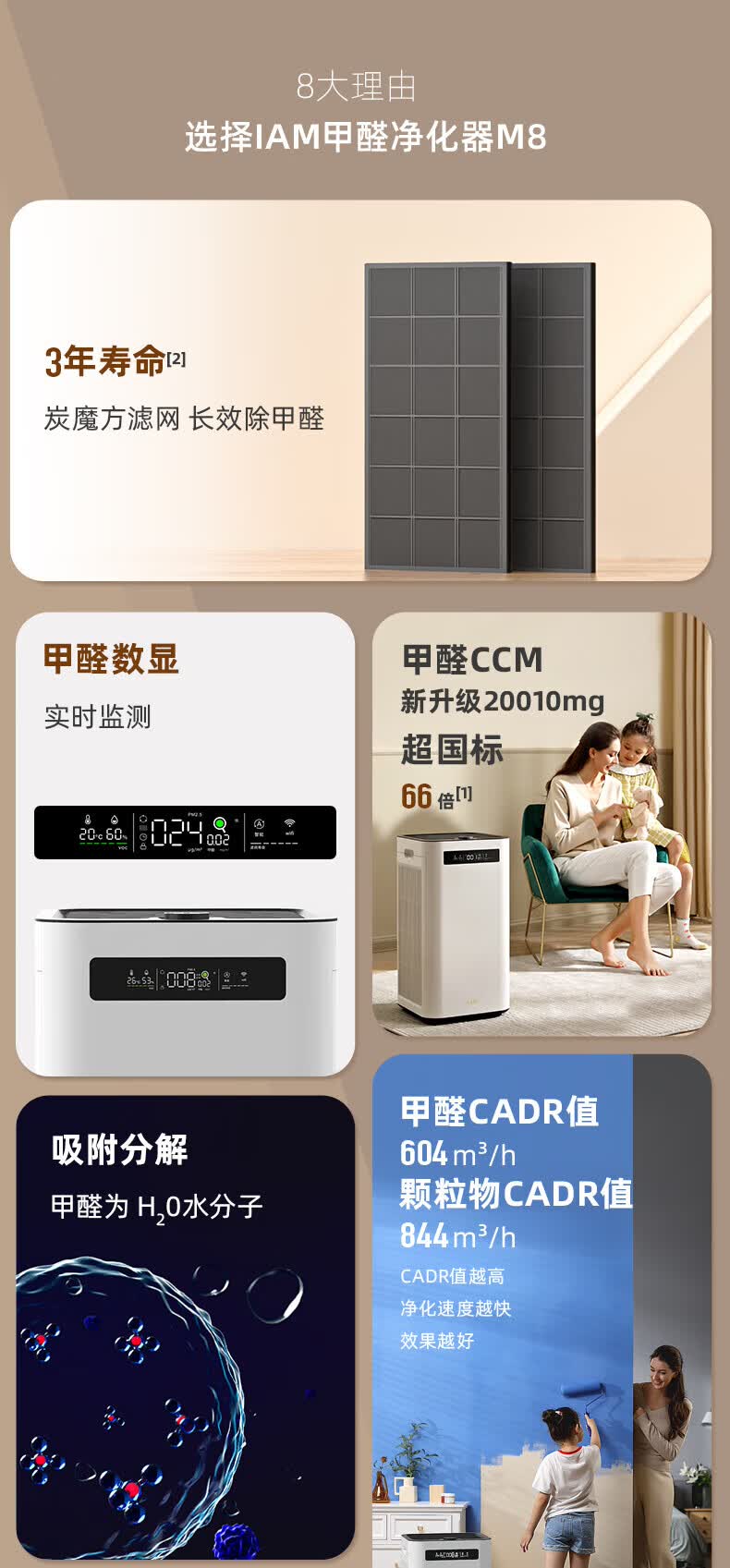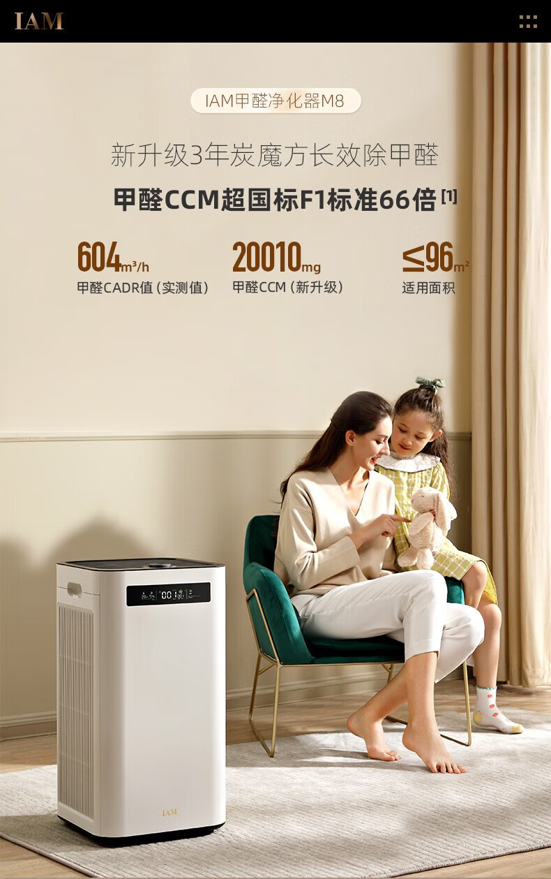 IAM空气净化器除甲醛雾霾细菌 家用负离子 空气净化机 甲醛数值显示 炭魔方3年长效分解甲醛M8